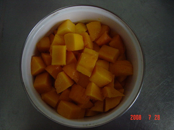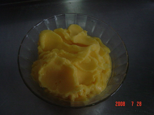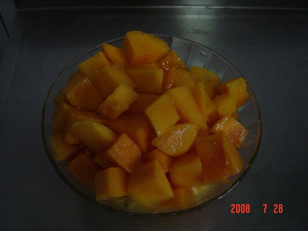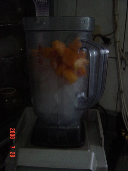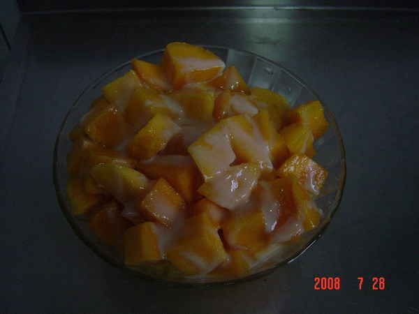 將冰塊及三分之一的芒果冰及煉奶放在果汁機打 打成泥後放進玻璃缽裡 上面再舖上剩餘的芒果丁 再淋上煉奶大功告成!