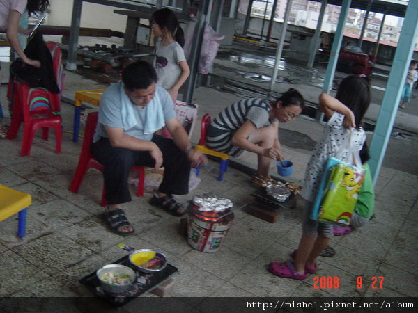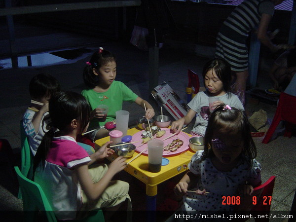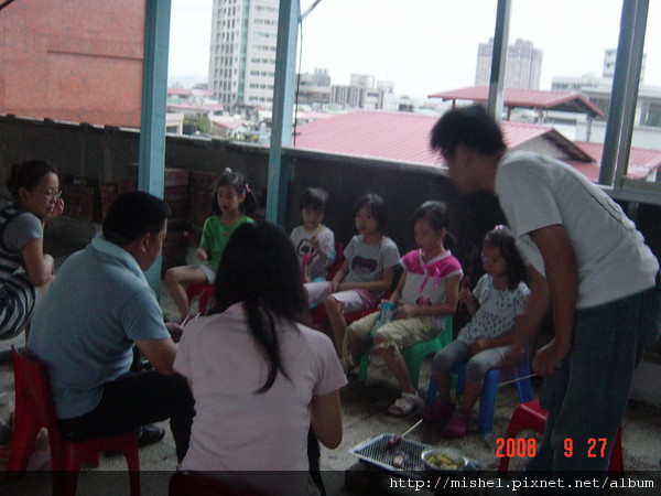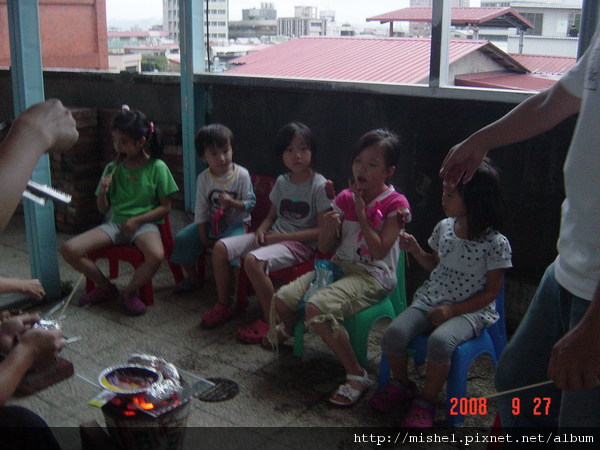 小孩子圍在烤爐前面,盯著爐上的食材瞧,深怕被大人”暗槓”,後來因風向的關係,煙都往那邊吹,所以小朋友就鳥獸散了!