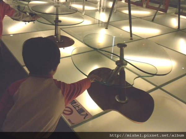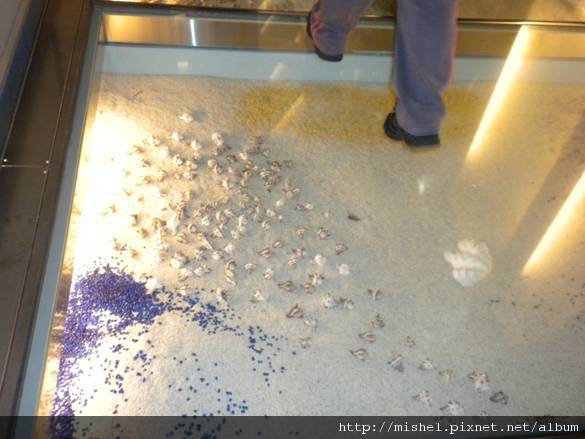 地面以三塊8mm厚度的強化玻璃膠合而成,可承重1,000公斤,並利用透明的特點在下方佈置燈光及沙灘造景。