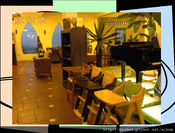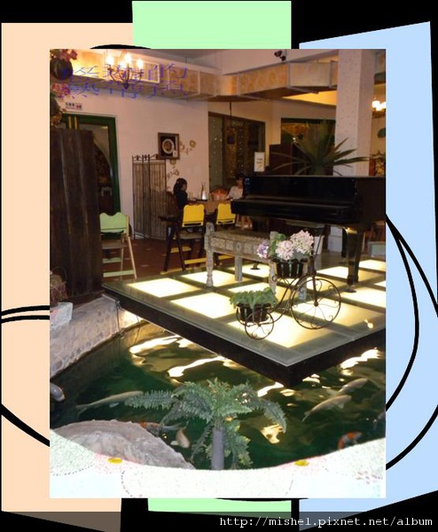 一樓挑高中庭魚池中央有一平台放有鋼琴