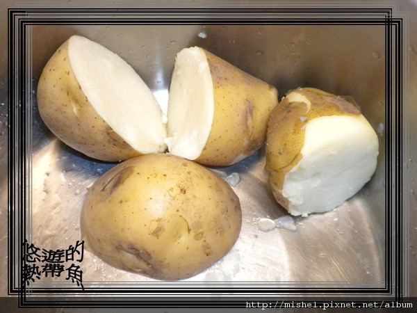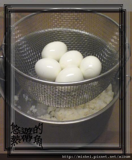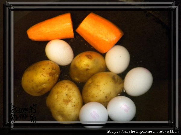 紅蘿蔔及馬鈴薯切半後和雞蛋一起放在水裡面煮熟
