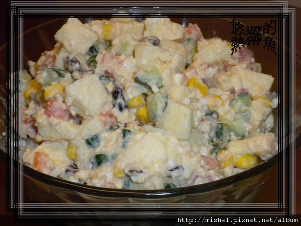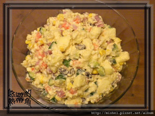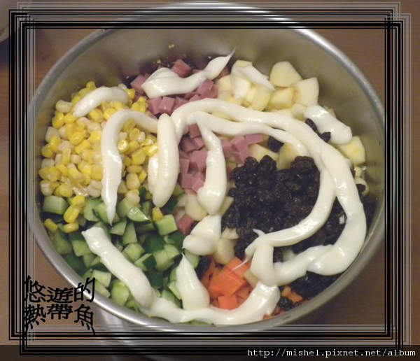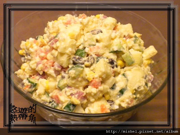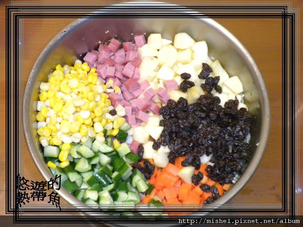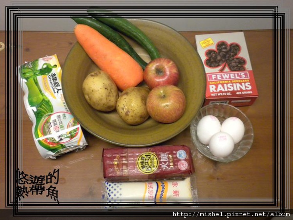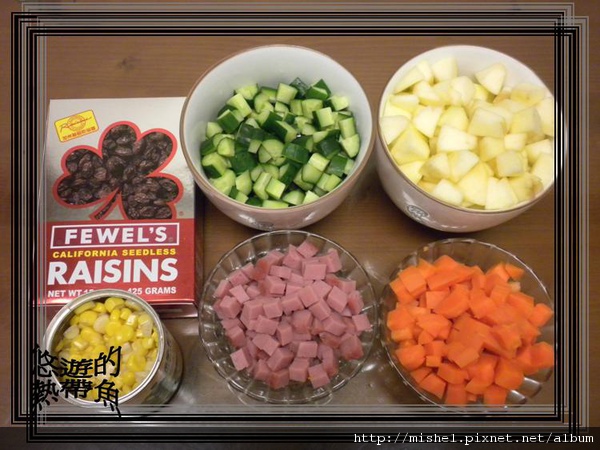 材料:小黃瓜、紅蘿蔔、馬鈴薯、蘋果、葡萄乾、雞蛋、火腿、美乃滋、玉米粒罐頭
