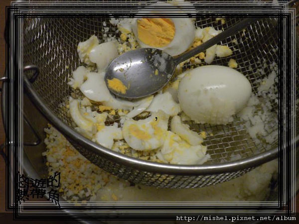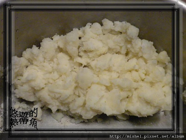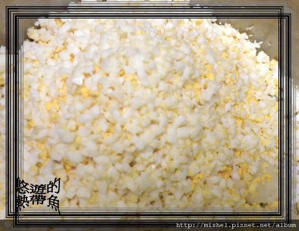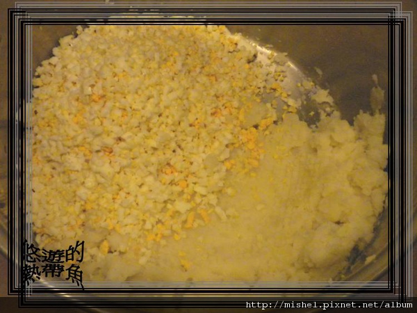 玉米粒、小黃瓜丁、紅蘿蔔丁、葡萄乾、蘋果丁及火腿丁放入攪和好的薯泥上面