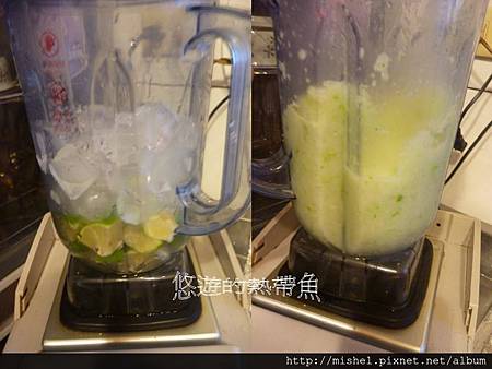 檸檬淨洗去頭去尾切塊,連冰塊一起放入果汁機裡面打
