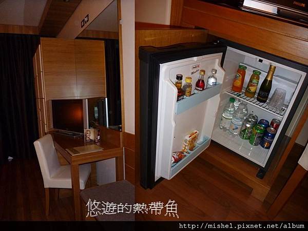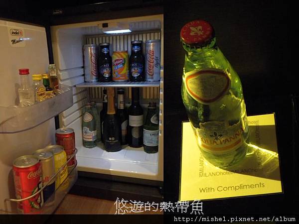 這裡的冰箱內容物最豐富,但是都要錢,唯獨只有床頭櫃擺放的一瓶玻璃瓶礦泉水免費