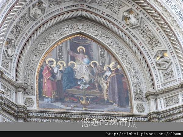 每扇門的上面點綴著精美的碎石鑲崁畫,上面則陳列一排聖母聖子與12門徒的雕像