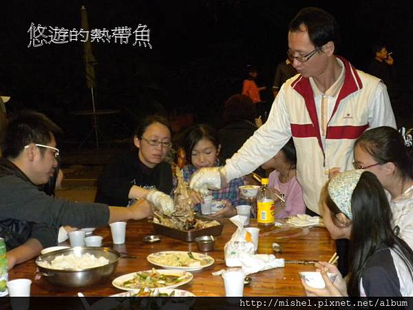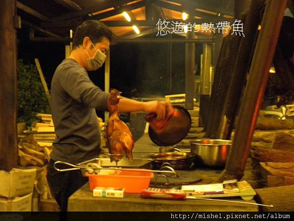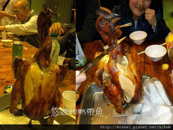 老闆正在將一隻烘烤完成的立正雞拿出來